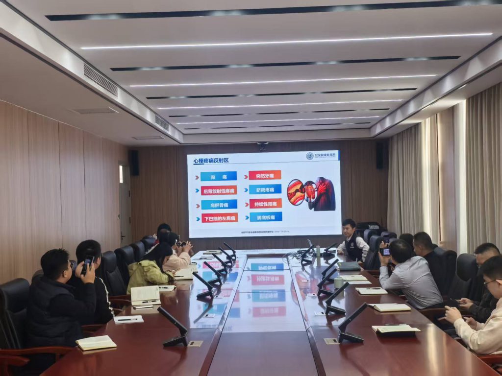 授课中,田宇科长结合自身丰富的宣教与实战经验,系统讲解了 AED 设备规范操作、“海姆立克” 急救法及 “心肺复苏” 等关键急救技能,通过通俗语言与真实案例生动演示操作要点,有效增强了职工应对突发情况的处置能力。在心脑血管疾病防治板块,讲师重点聚焦急性脑梗、心源性猝死、脑卒中及 “四高” 等高发疾病,深入剖析其诱因与前期症状,结合临床经验给出科学预防建议,并针对 “四高” 人群提供具体的饮食调理与规范用药指导,助力职工树立 “防大于治” 的健康理念。