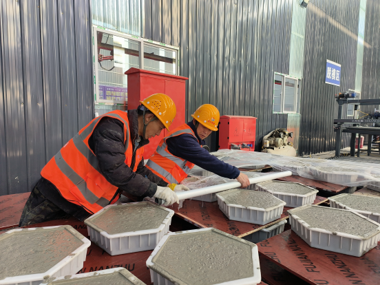该构件场主要生产路基边坡防护格网预制块、路基边坡预制泄水槽等小型混凝土构件。生产线通过精准模具定位和高频率振捣,保证构件内部密实,结合自动化控制与高光面模具,使预制构件表面平整光洁、色泽均匀,提升外观质量和耐久性。