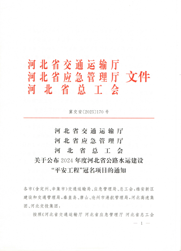 “平安工程”冠名是我国公路水运工程建设领域安全生产管理方面的最高荣誉,号称安全管理领域的“鲁班奖”。获得该称号的工程均为各地区典型的施工难、风险高的建设项目,经省交通运输厅、省应急管理厅及省总工会等部门严格评审后产生,代表了行业施工和安全管理最高水平。