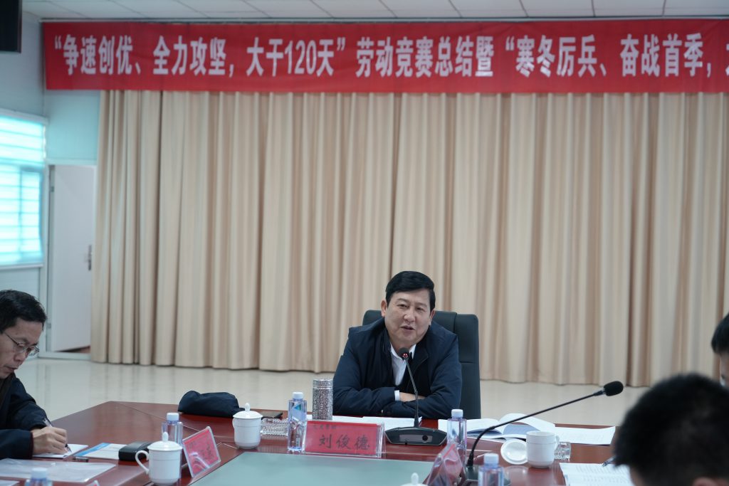 1月3日,雄港公司在曲港高速二期项目L1标会议室组织召开“争速创优、全力攻坚,大干120天”劳动竞赛总结暨“寒冬厉兵、奋战首季,大干90天”专项活动动员会。交发集团党委书记、董事长刘俊德,总工程师徐卫东出席会议,会议由集团公司副总经理常志明主持。交发集团建设管理部相关负责人,雄港公司班子全体、各部室负责人,总监办、各驻地办、各施工单位主要负责人,以及受表彰的先进代表参加会议。此次会议旨在深入总结上一阶段劳动竞赛成果,动员部署新一轮攻坚任务,为确保实现2026年首季及全年建设目标凝聚合力、提振干劲。